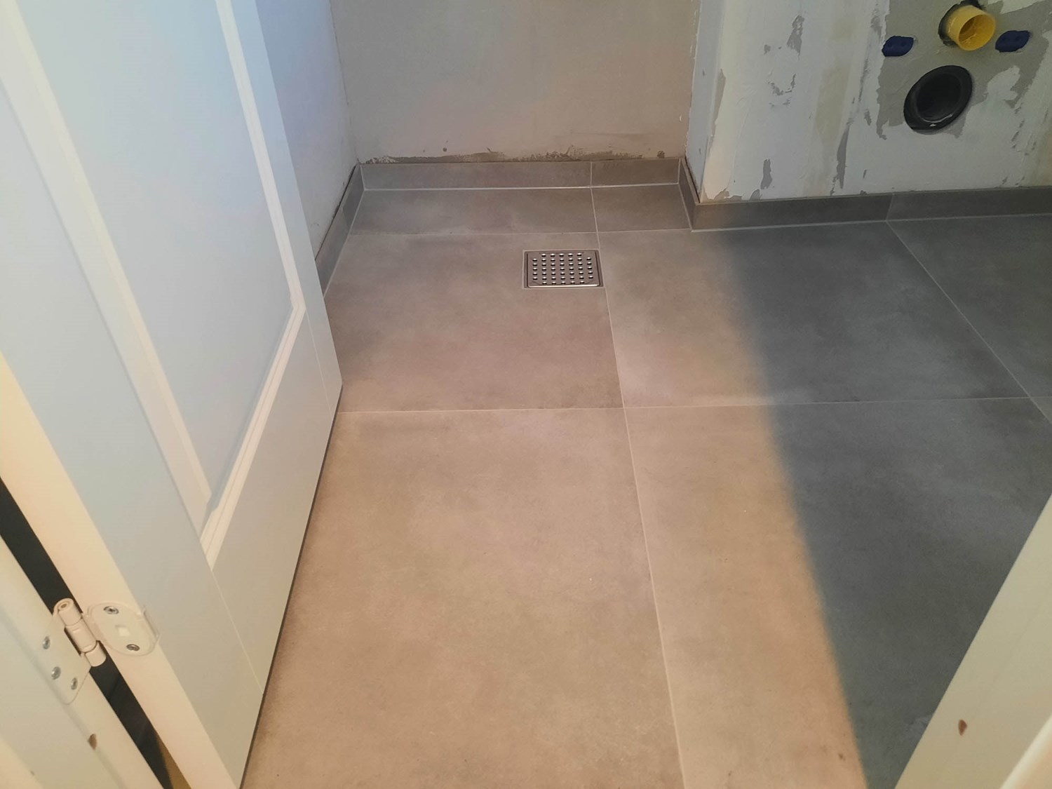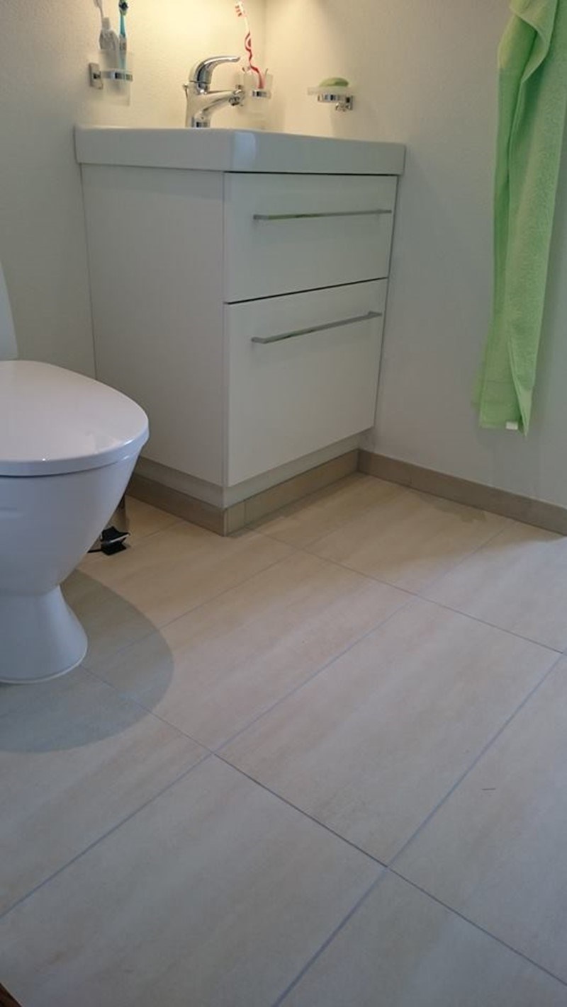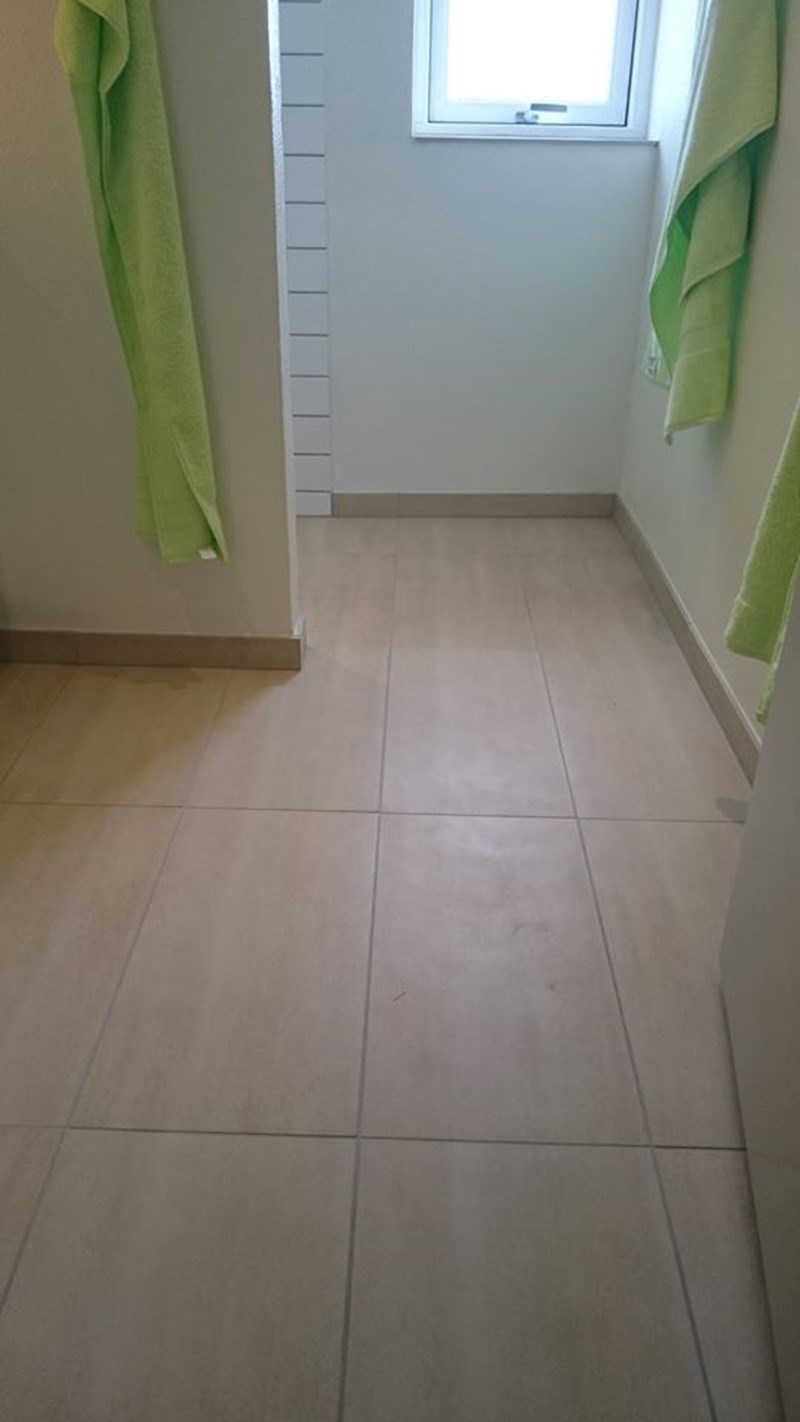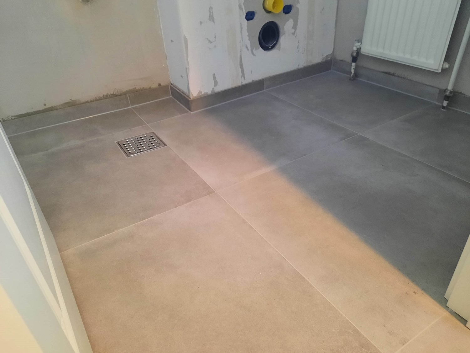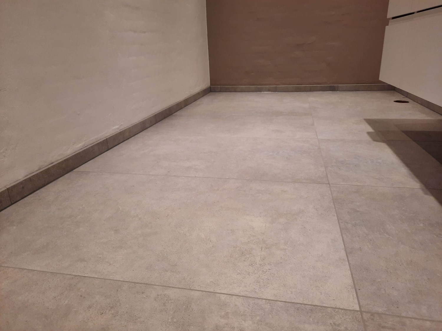 Eksisterende klinker blev banket af og der blev tilrettet fald i badeværelse og rettet gulve til i de øvrige rum og lagt en flot grå 60×60 klinke med lys grå epoxy fuge.