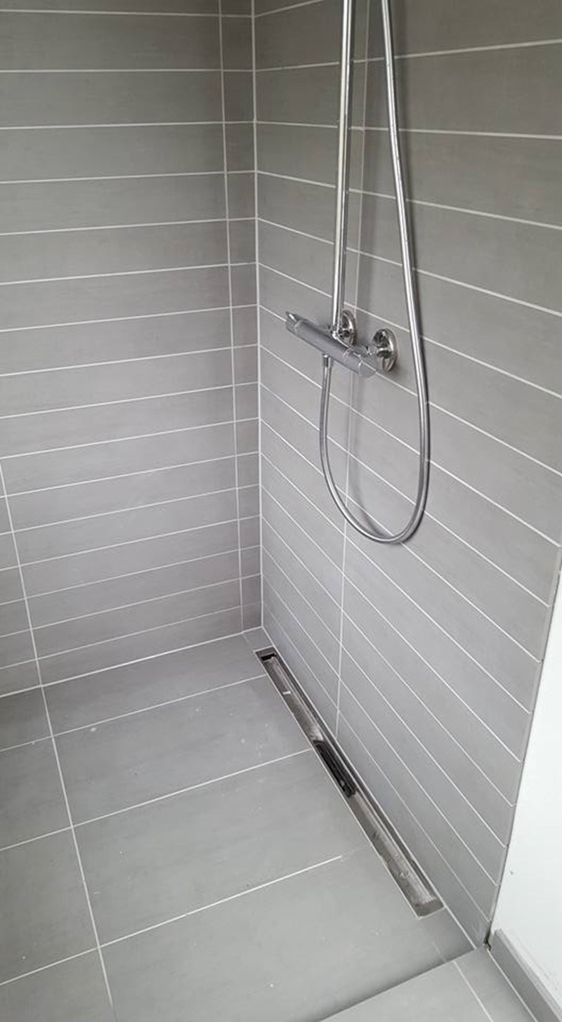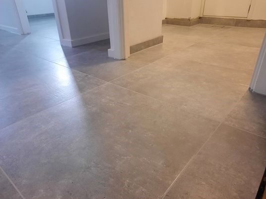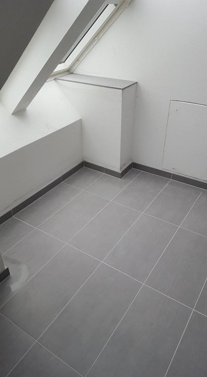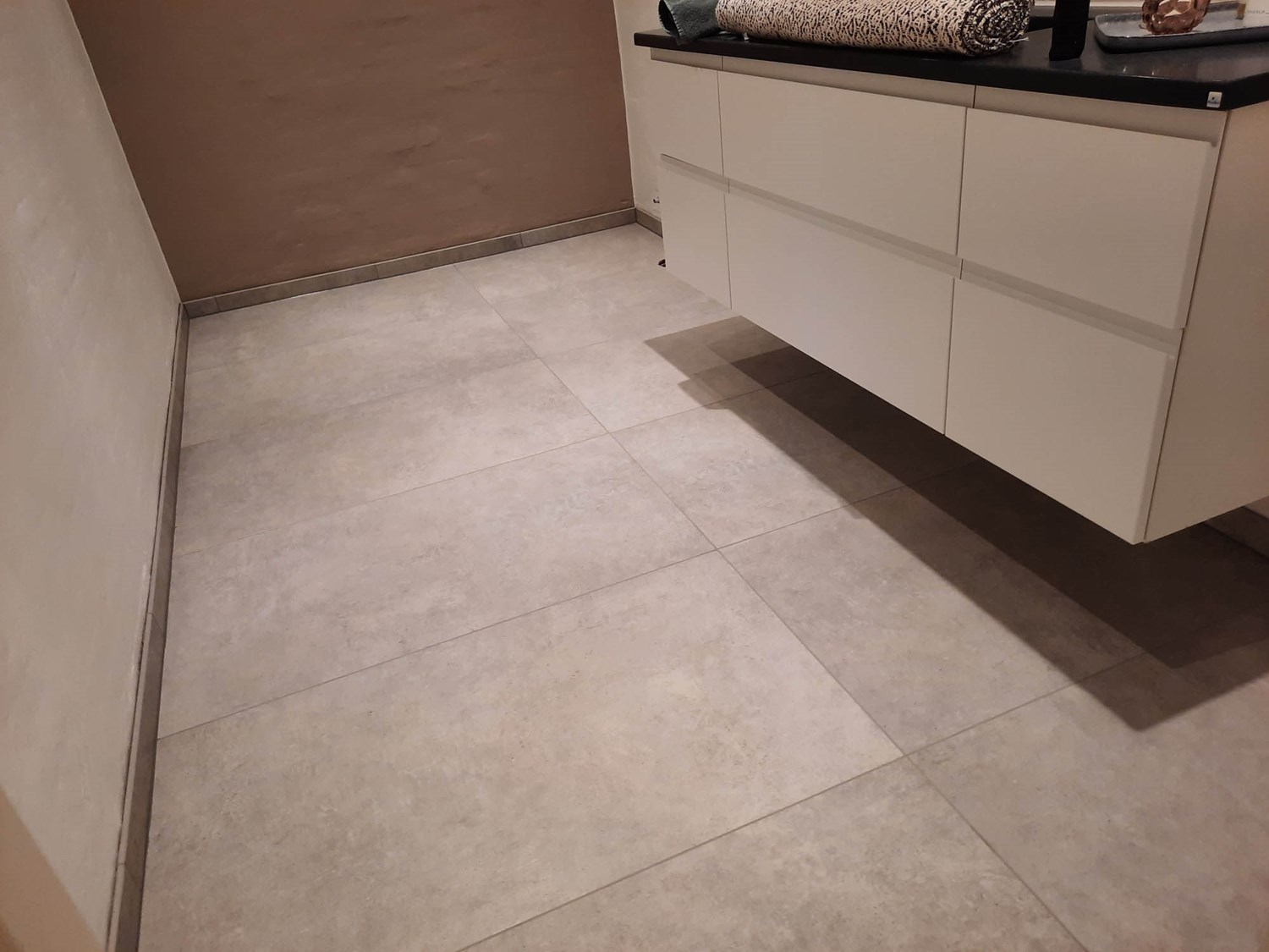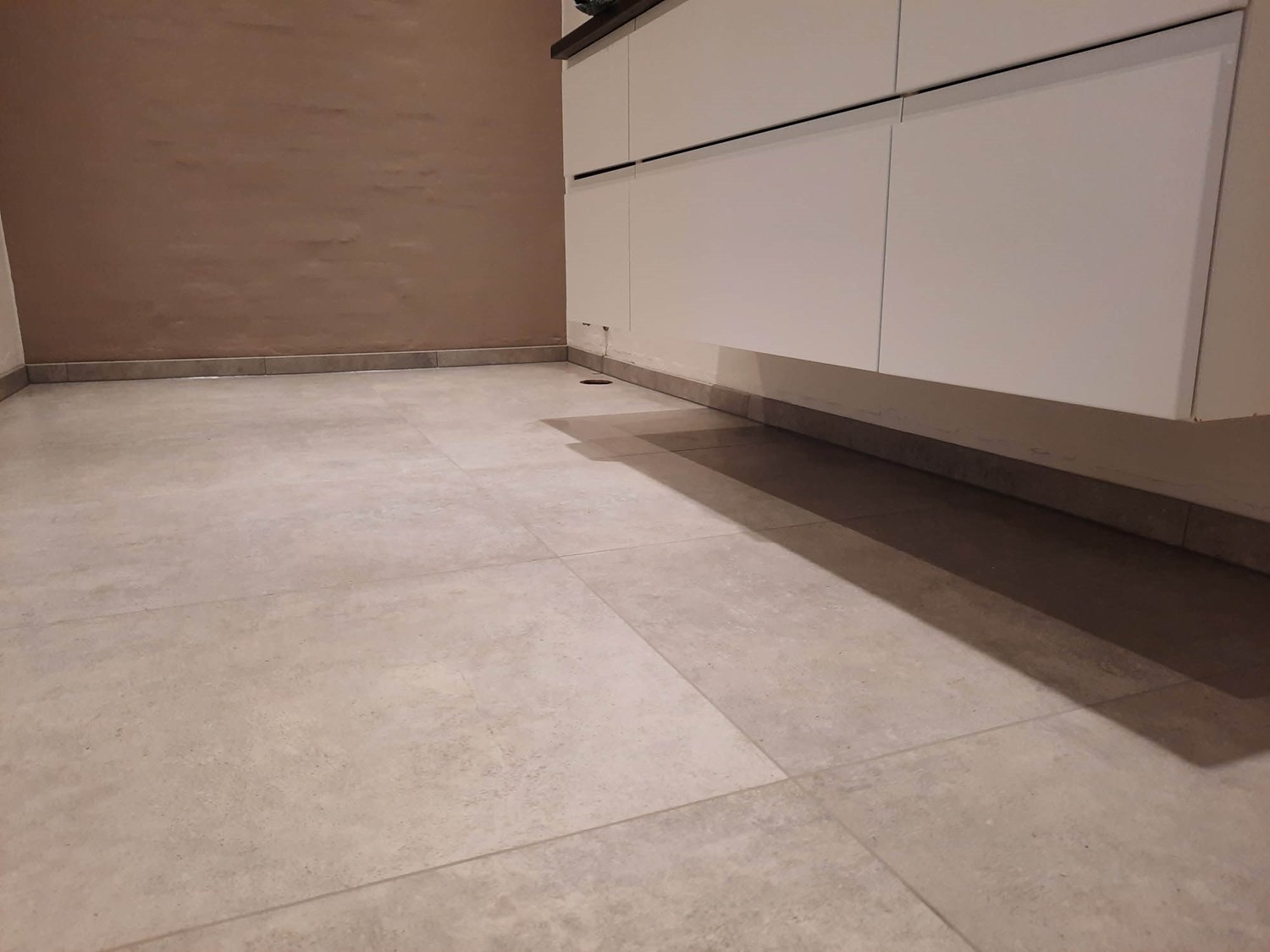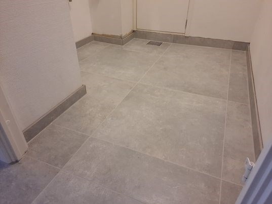 Eksisterende klinker blev banket af og der blev tilrettet fald i badeværelse og rettet gulve til i de øvrige rum og lagt en flot grå 60×60 klinke med lys grå epoxy fuge.