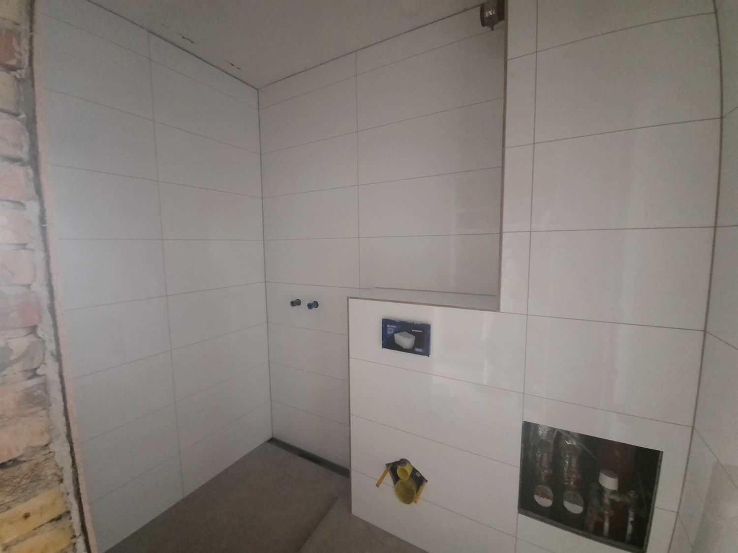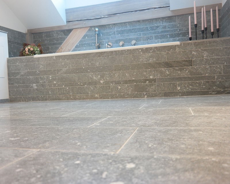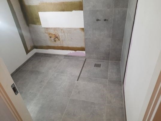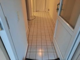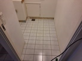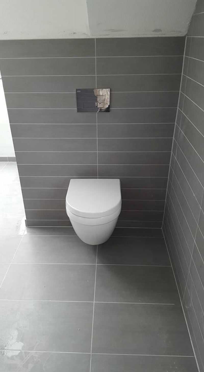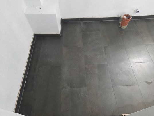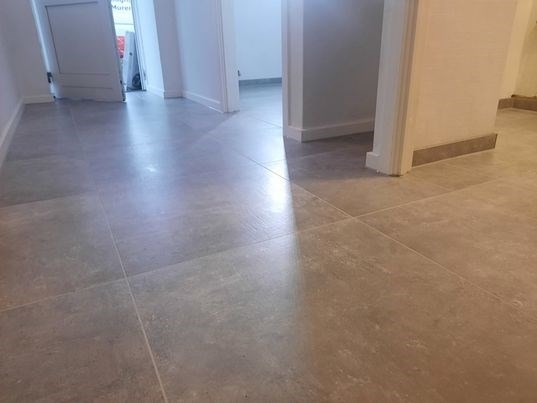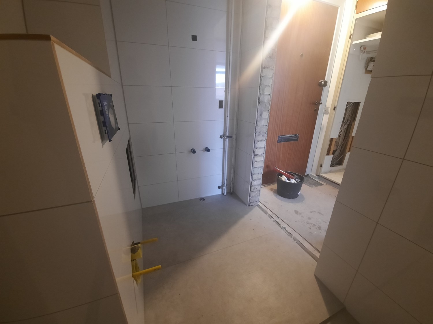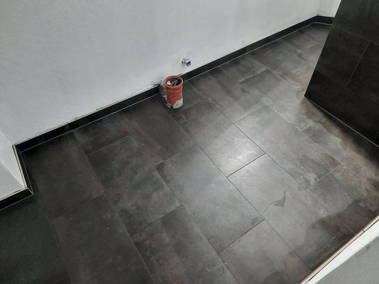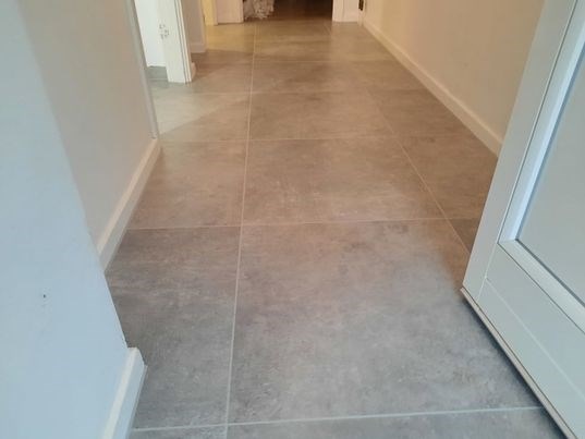 Eksisterende klinker blev banket af og der blev tilrettet fald i badeværelse og rettet gulve til i de øvrige rum og lagt en flot grå 60×60 klinke med lys grå epoxy fuge.