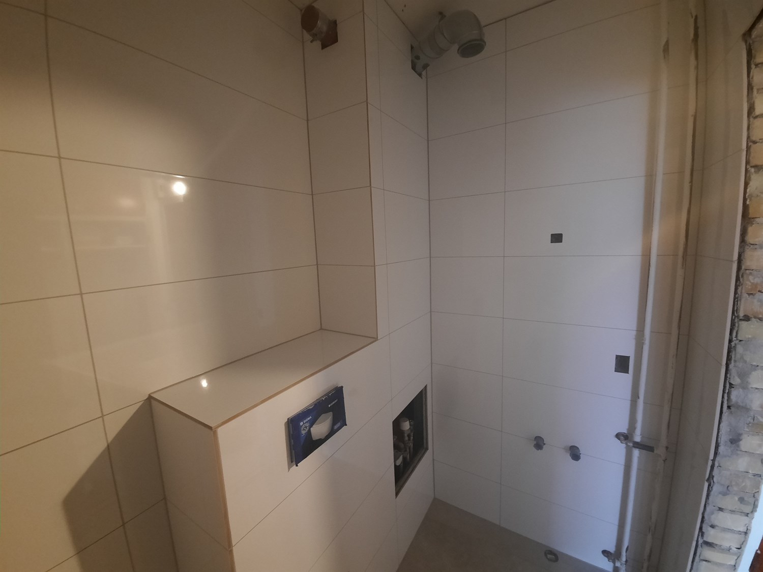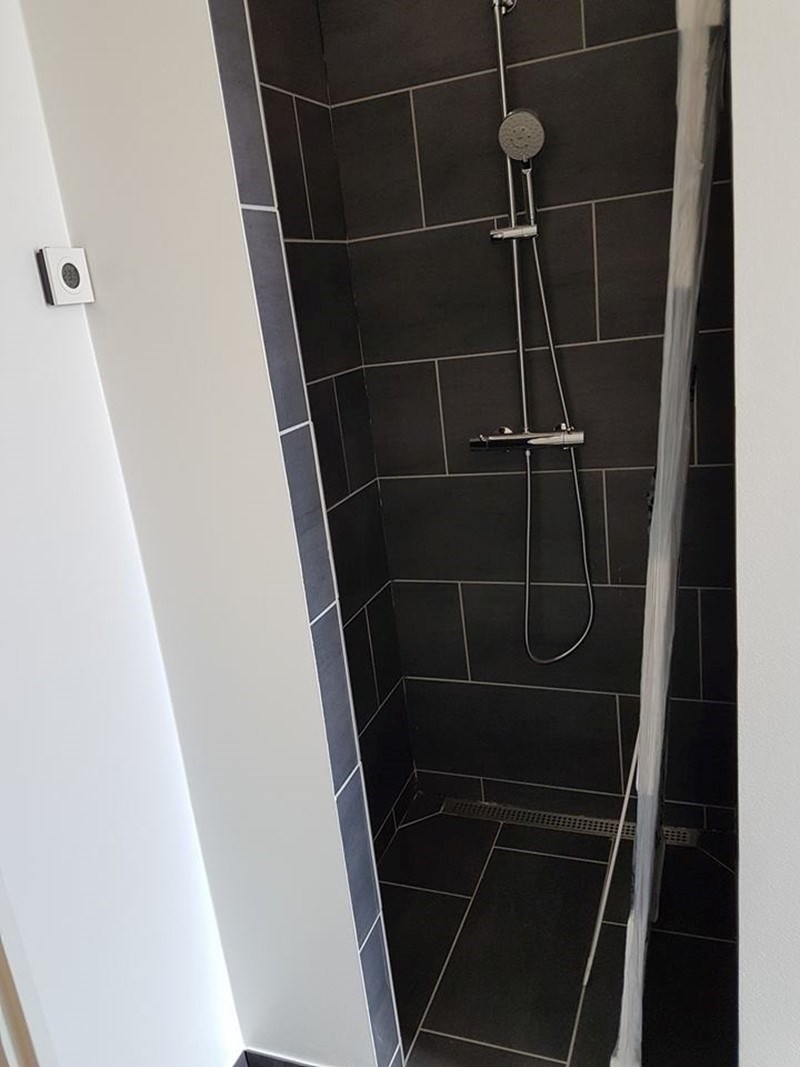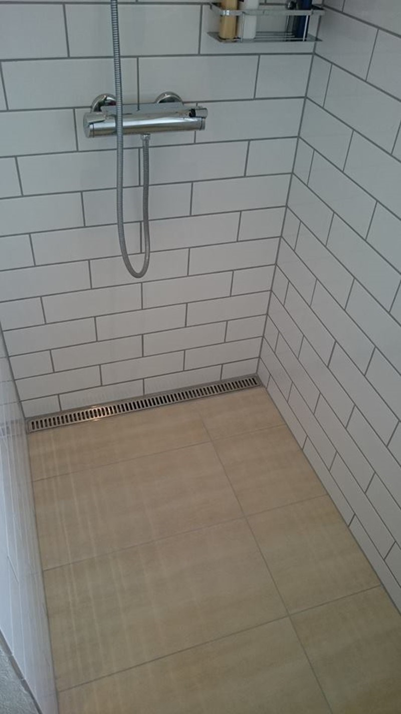 Det oprindelige badeværelse er opført i røde 10×20 fliser på væggene, som var moderne da man opførte husene i 70´erne. Kunden ønskede en modanisering af badeværelset samt en omforandring, da man ikke længere ønskede badekarret, men derimod en bruseniche. Der blev valgt en lys beige 30×60 klinke til gulvet, som giver et naturligt lyst rum, da man oveni sløjftede et vindue. Denne type klinke giver en større rumfølelse samt et roligt stilrent rum med de store klinker. På væggene bruges der hvide blanke 10×30 fliser til den nyopførte bruseniche.