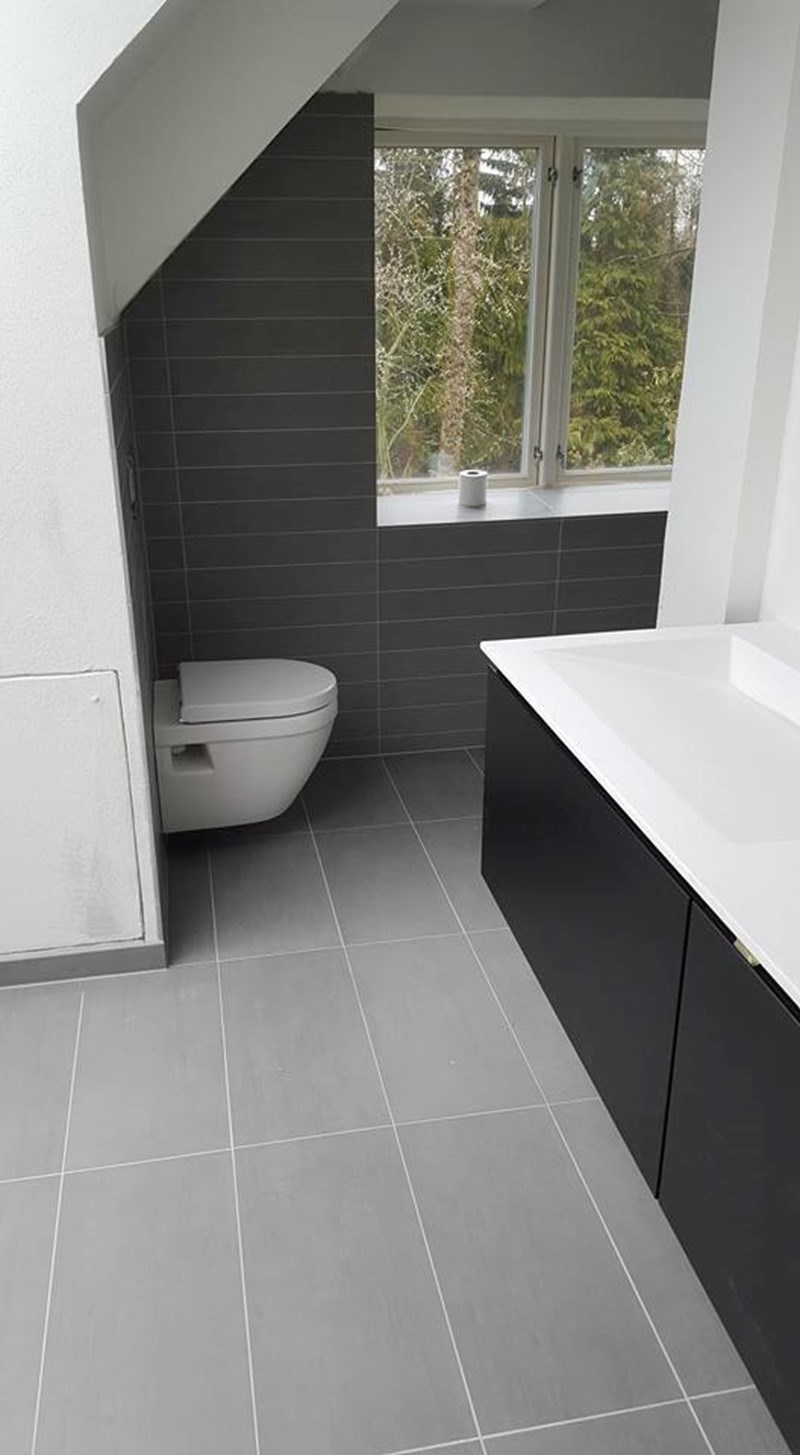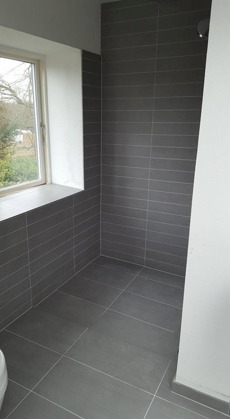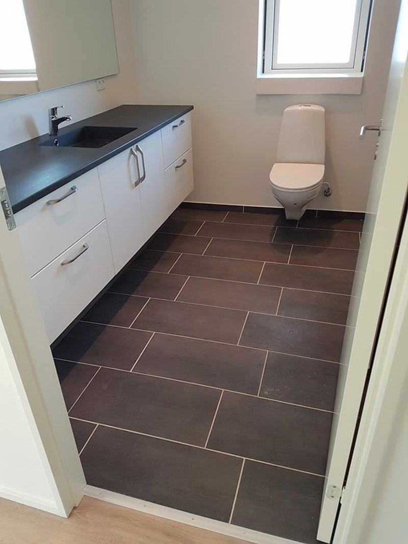 Udført flisearbejde i Eurodan typehus, i en mørk 30×60 klinke. Med det rette lysindfald, vil denne klinke give en flot kontrast til de hvide badeværelses elementer som giver et flot stilrent udtryk.