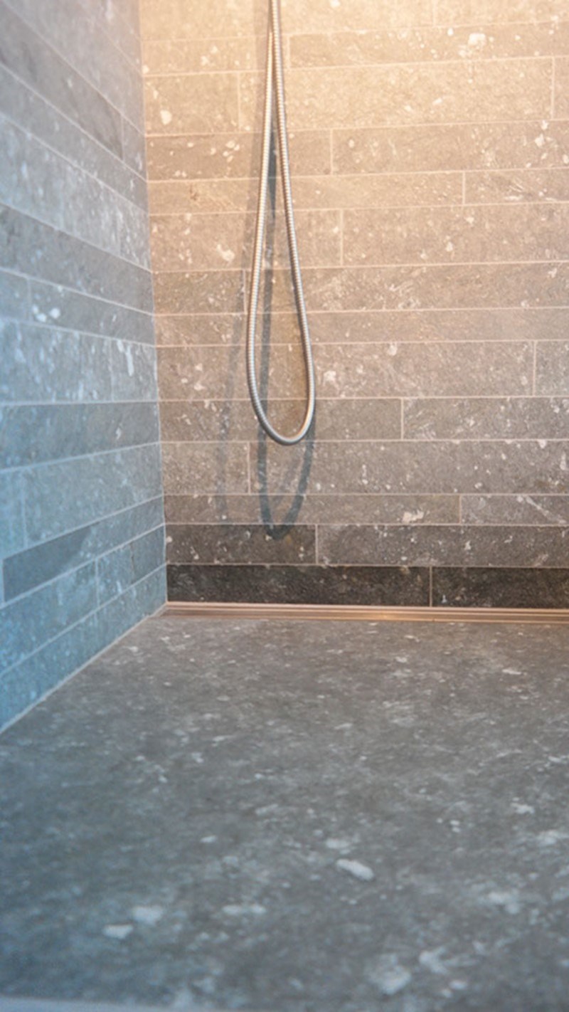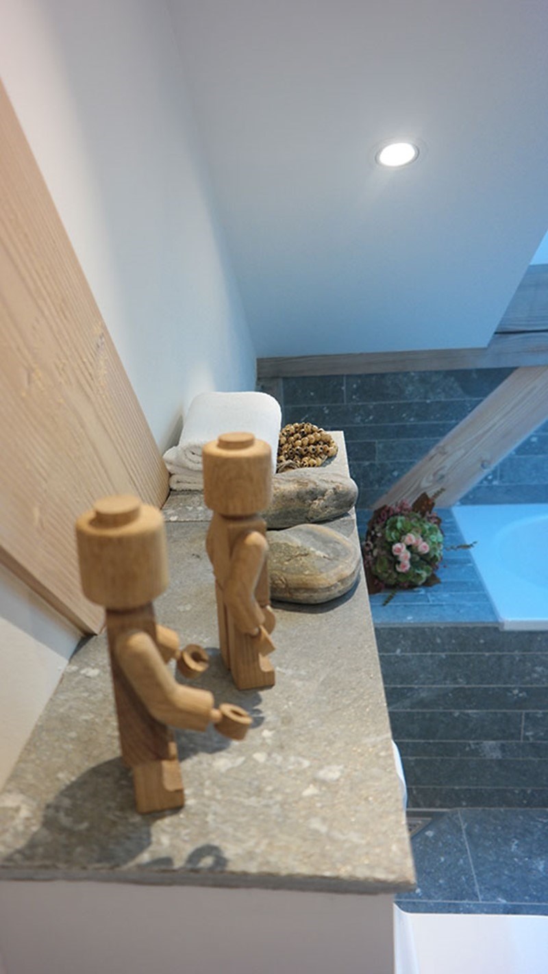 Gennemførte badeværelser i en flot mørk granit. De bare træbjælker komplimentere granittens rå look og giver badeværelset et imponerende udtryk.